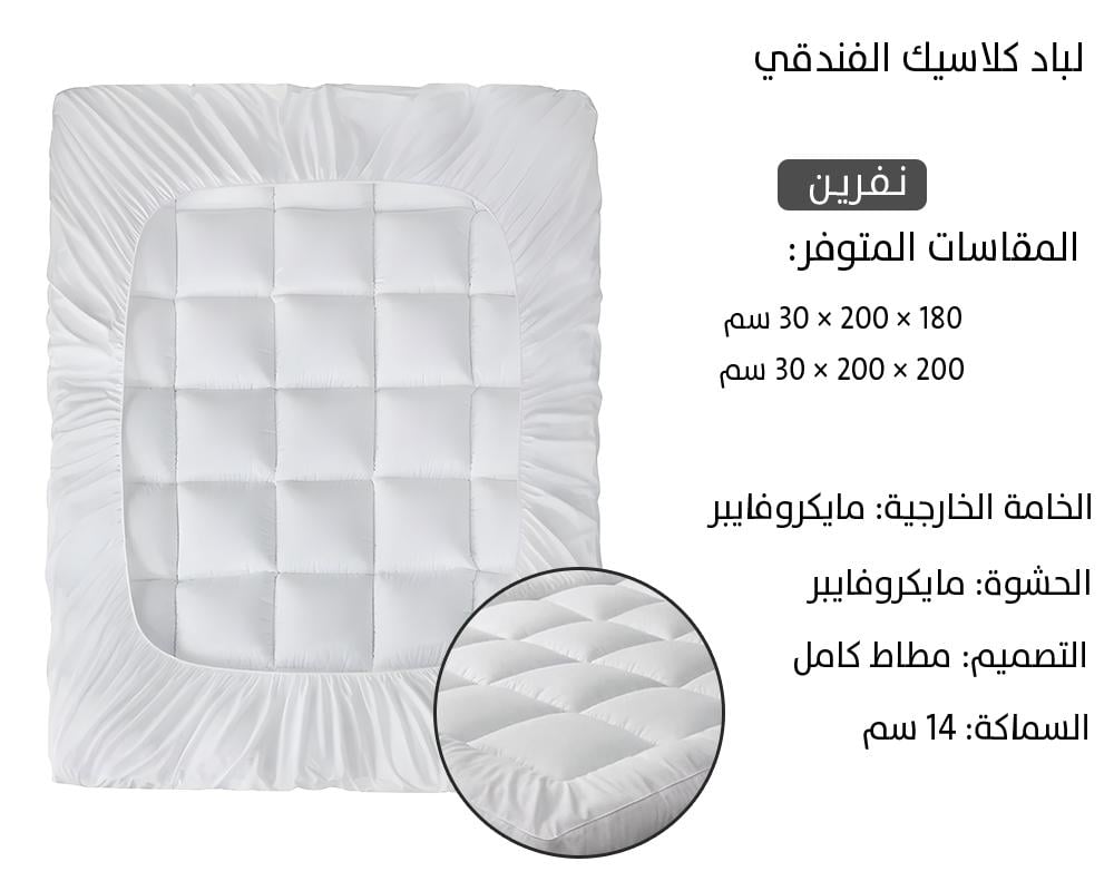 تمتع بنوم هادئ ومريح مع لباد كلاسيك نفرين الفندقي الذي يجمع بين الفخامة والراحة التامة. صُمم هذا اللباد خصيصًا لتوفير أقصى درجات الاسترخاء والدعـم لجسمك طوال الليل، مما يجعله الاختيار المثالي لأي شخص يبحث عن تجربة نوم مثالية.